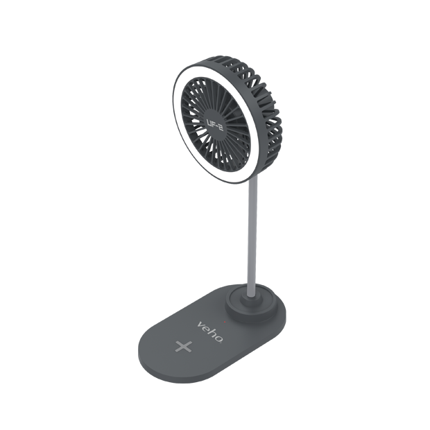 The Veho UF-2 is a multipurpose 3-in-1 desktop station equipped with a wireless 15W smartphone fast charger, 3-speed fan, and bright LED ring light.