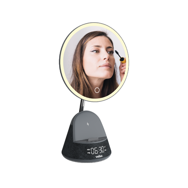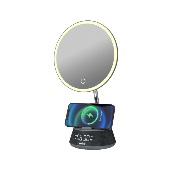The Veho SQ-1 is an essential addition to your room, with an ultra-high definition mirror and 15W Qi wireless charging for easy fast charging. The base has a built-in Bluetooth speaker and an FM radio with automatic station search. The SQ-1 is equipped with an LED right light with 3 brightness options. A perfect bedroom accessory, the SQ-1 has a built-in alarm function with a 12hr/24hr clock and white noise function. When away from a power source, the 1200mah battery will give up to 5 hours of use.